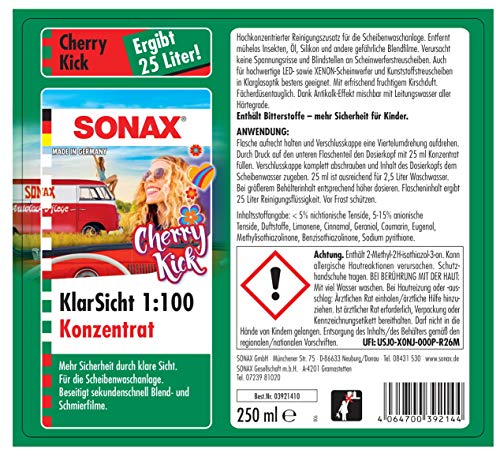 Specification: SONAX KlarSicht 1:100 concentraat Cherry Kick (250 ml) sterk geconcentreerd reinigingsadditief voor de…